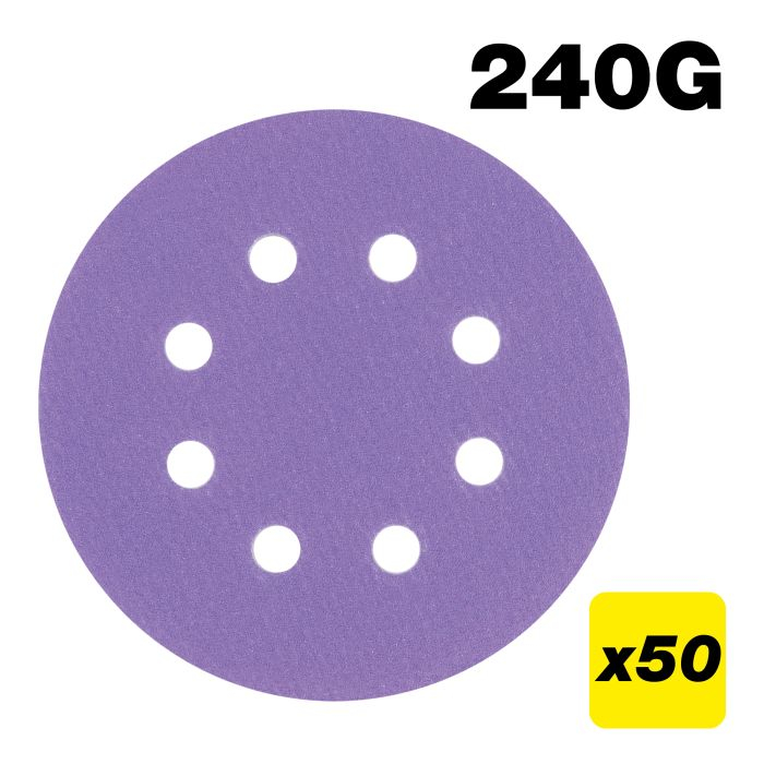 Aluminium Oxide Random Orbital Sanding Disc 240 Grit 125mm 50pc. Type=Aluminium Oxide|Grit=240|Diameter=125 mm High performance multi-material long life Aluminium Oxide abrasive for 125mm Diameter Random Orbit Sanders. Suitable for wood, paint, plaster and metal|SUPERIOR DUST EXTRACTION Elongated hole pattern ensures base compatibility and aids maximum extraction capability|EASY ALIGNMENT Unique punch pattern for easy extraction hole alignment for faster application|125mm RANDOM ORBIT APPLICATIONS INCLUDE Single handed sanding, keying, secondary preparation, cleaning and fine finishing easy control on horizontal and vertical surfaces|125mm DIAMETER DISC Fits all hook and loop base 125mm random orbit sanders|ANTI CLOGGING OPEN COAT increased spacing between the grit particles of grains reduces clogging and allows fast stock removal especially on gummy, resinous timbers, fillers and paint removal|DUAL RESIN BONDING LAYERS two layers of resin keeps the abrasive grit firmly bonded to the backer for increased lifespan|3x LIFESPAN Highly durable Aluminium Oxide grit maintains performance gives 3 times longer life than conventional abrasives|MULTI MATERIAL Ideal for use on wood, paint, metal and plaster|3 GRIT OPTIONS 120, 180 and 240 grit for preparation work, keying, de-nibbing and fine finishing applications|HOOK AND LOOP FIXING Secure fix to the power tool base. Fast easy removal, increasing productivity when working through grits|UNIVERSAL DUST HOLE PATTERN hole design ensures maximum compatibility on popular orbit sanders|CONTROLLED CUT Finer grits for high quality preparation and finishing on all materials|LONG LASTING FILM BACKING Flexible backer minimises cracking and grit loss for long lasting sanding and durability