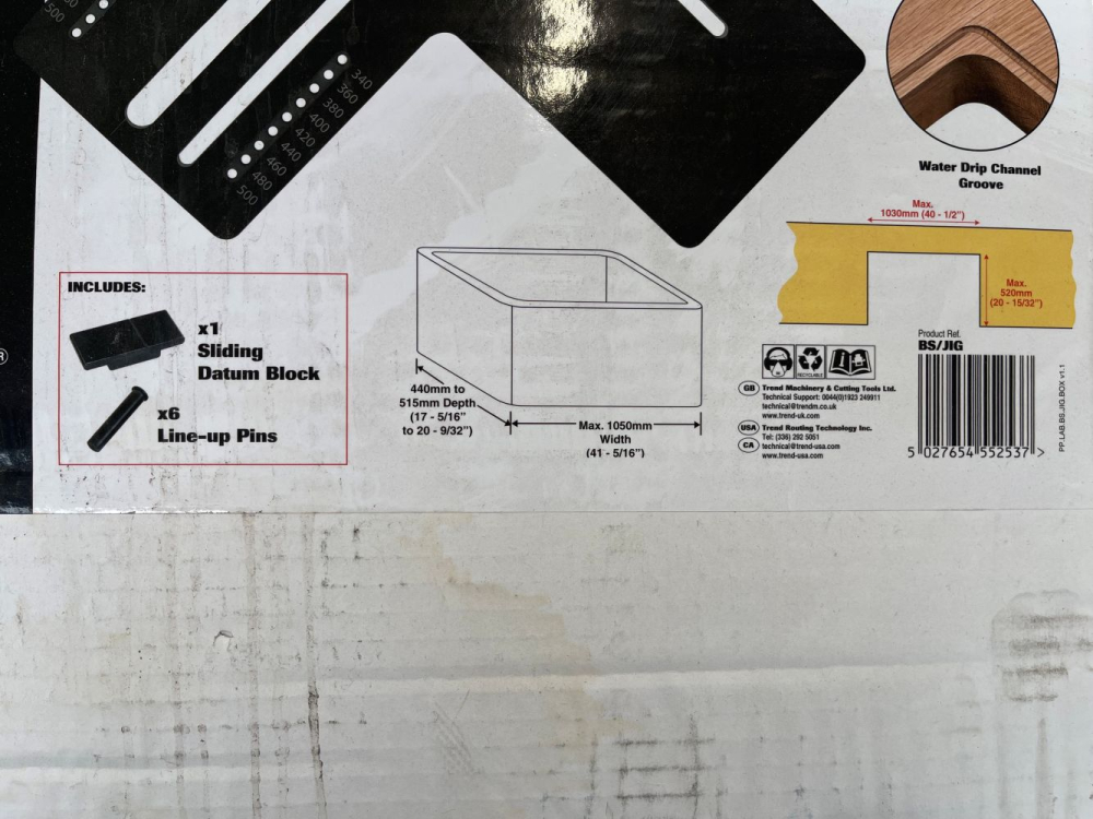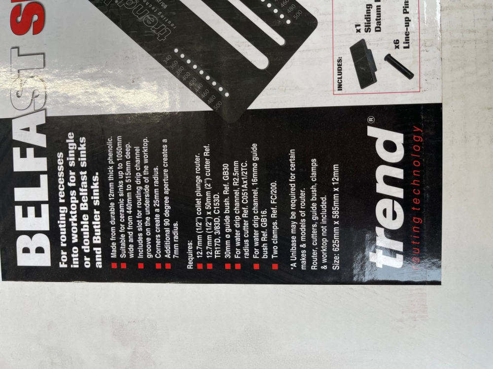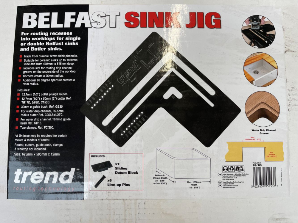 Belfast sink jig . Length= 625 mm|Width= 590 mm|Thickness=12 mm|Weight=3.6kg For routing Belfast /Butler sinks.|Made from 12mm hardwearing CNC machined Compact Grade High Pressure Laminate.|Will also allow drip channel groove to be routed on the underside of the worktop.|Corner radius of 25mm. Maximum distance 630mm or 1030mm when overlapping slots.|For sinks 1050mm wide and 440mm to 515mm deep.|Twin pin location for stable and accurate lining up of jig. Preset holes for 340mm, 360mm, 380mm, 400mm, 420mm, 440mm, 480mm and 500mm width, a packing piece required for sizes in between.|Jig requires:|A portable plunge router with 12.7mm (1/2 inch) shank capacity and minimum 1300 watts.|A template guide bush with 30mm outside diameter for main recess and 16mm outside diameter for water drip groove.|A TCT router cutter with 12.7mm (1/2 inch) diameter and 50mm (2 inch) cut length for main recess and a radius cytter R2.5mm for the water drip groove.|Two 100mm (4 inch) throat clamps.|Supplied with clear & comprehensive instructions for use.